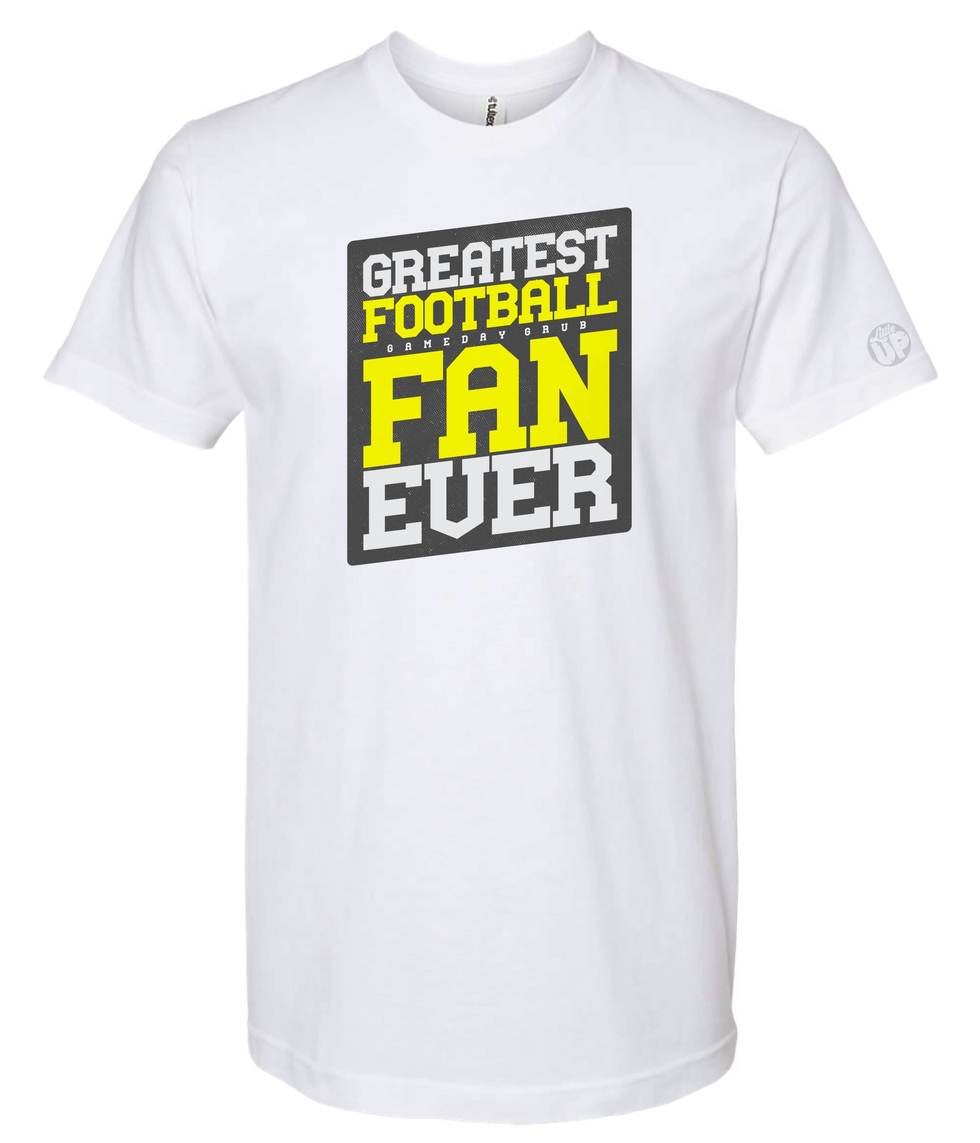 "Greatest Football Gameday Grub Fan Ever" in white and yellow on pre-shrunk 100% ring-spun USA cotton tee with tear away label.